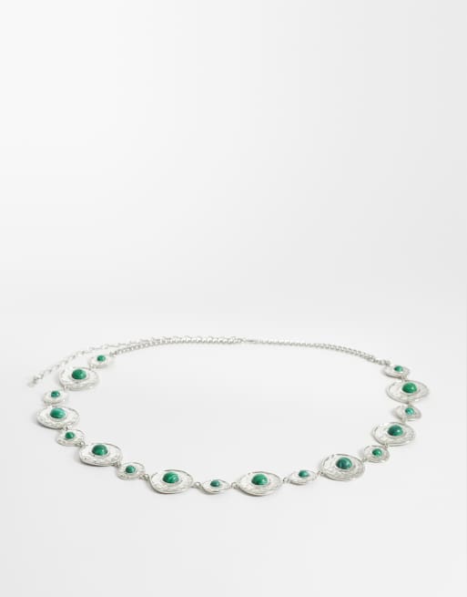 ASOS DESIGN Curve - Cintura a catenina per vita e fianchi tonalità argento con pietre verdi