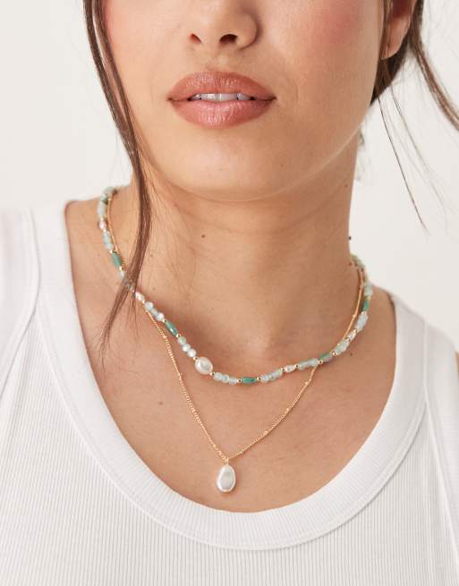 ASOS DESIGN Curve - Collana multifilo con perline e pendenti con perle sintetiche blu e dorata