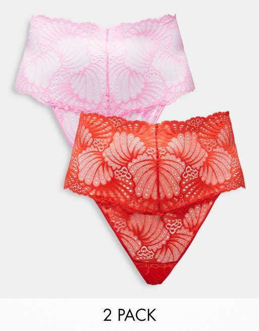 ASOS DESIGN Curve - Confezione da 2 perizomi in pizzo rosso e rosa con fascia ampia