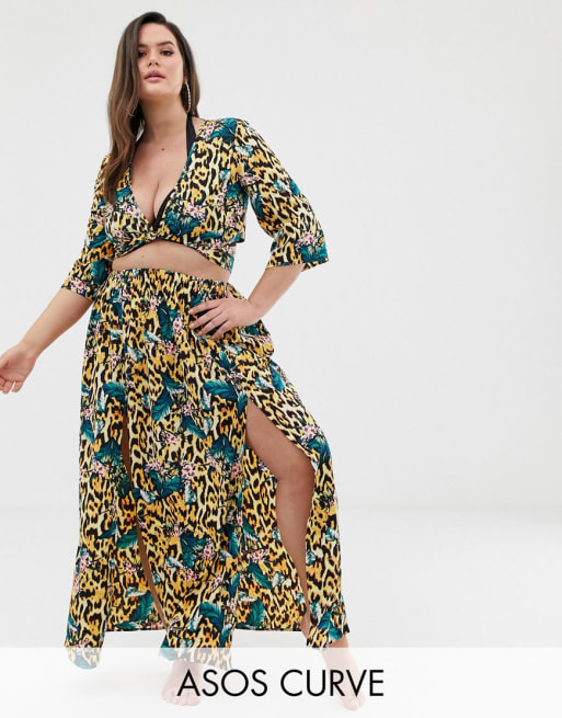 ASOS DESIGN Curve - Coordinato da mare animalier tropicale con gonna e top con laccetti