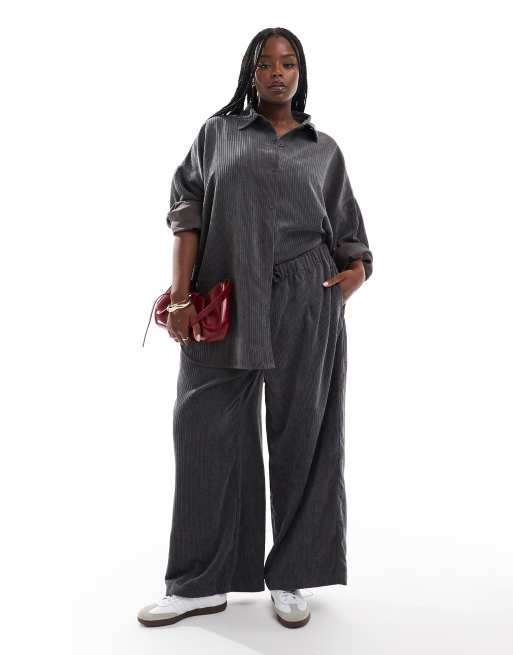 ASOS DESIGN Curve - Coordinato grigio in velluto a coste con camicia e pantaloni