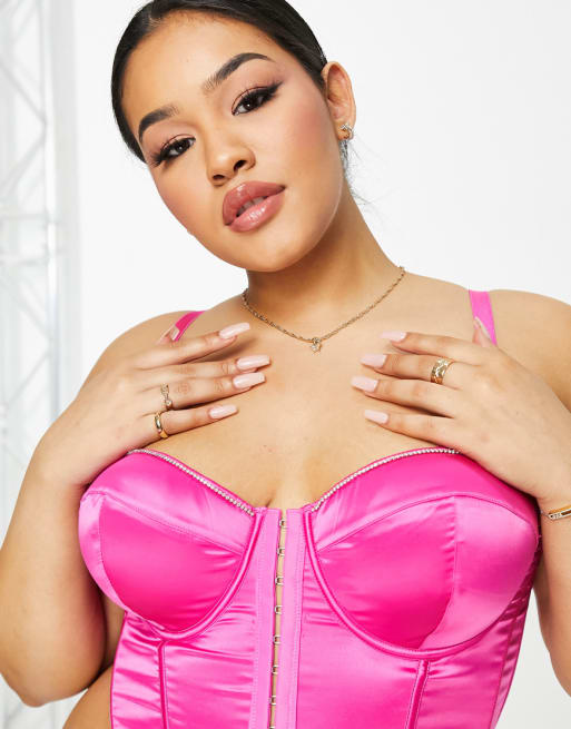 ASOS DESIGN Curve - Deyanna - Corsetto e perizoma in raso color rosa vivo