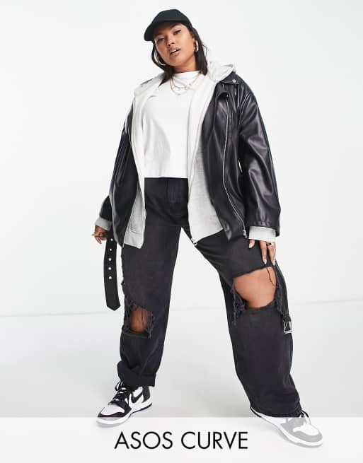 ASOS DESIGN Curve - Giacca biker oversize lunga in pelle sintetica nera