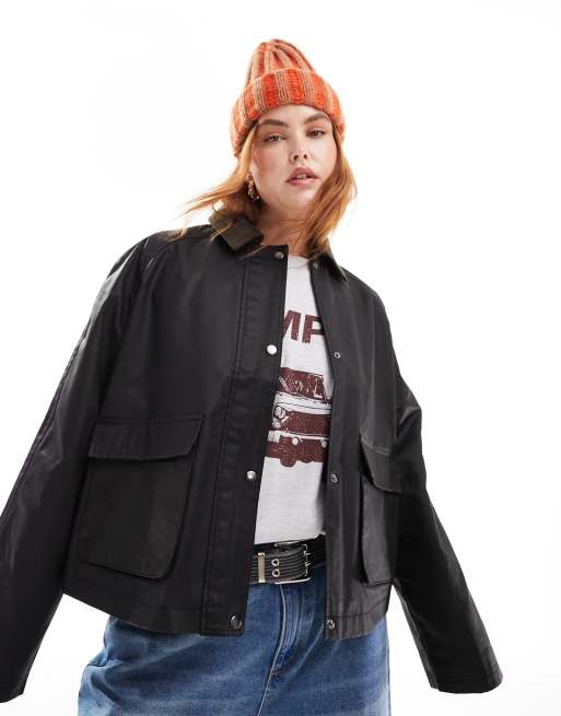 ASOS DESIGN Curve - Giacca corta marrone cerata con colletto a contrasto
