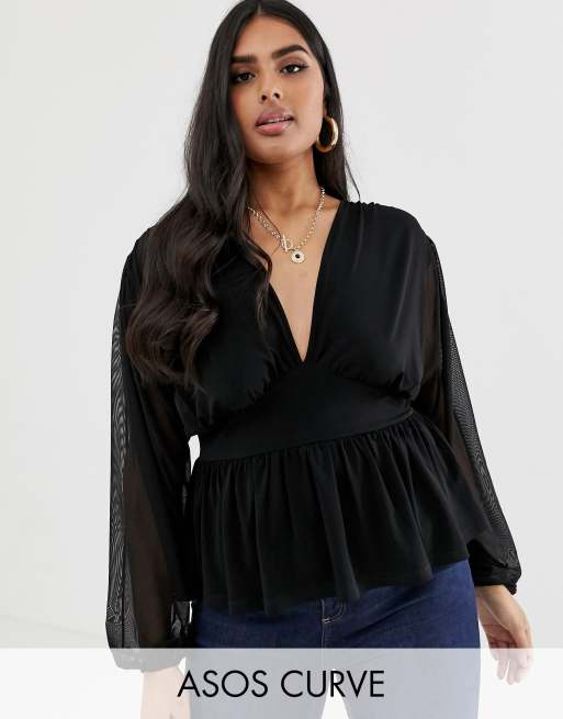 ASOS DESIGN Curve - Maglia con maniche lunghe in rete a palloncino