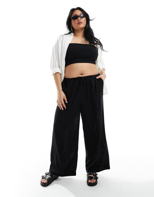 ASOS DESIGN Curve - Pantaloni a fondo ampio neri in misto lino