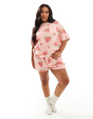 ASOS DESIGN Curve - Pigiama oversize rosa con stampa di anguria con T-shirt e pantaloncini