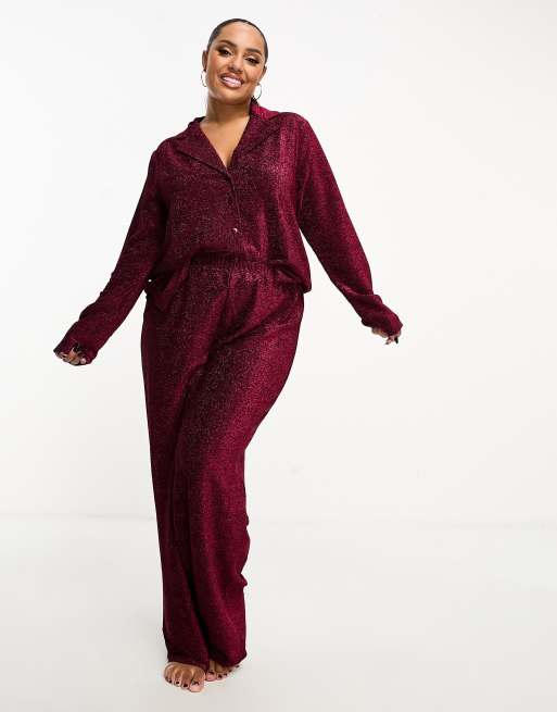 ASOS DESIGN Curve - Pigiama rosa glitterato con camicia e pantaloni