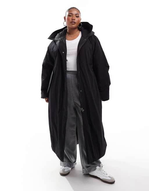 ASOS DESIGN Curve - Piumino lungo con cappuccio nero liscio