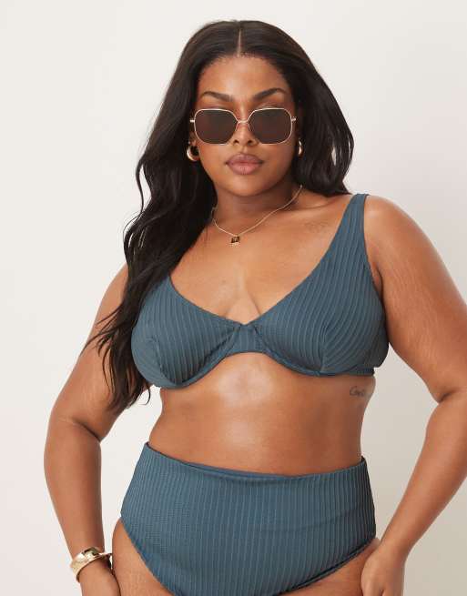 ASOS DESIGN Curve - Riddy - Top bikini con ferretto a coste blu ardesia