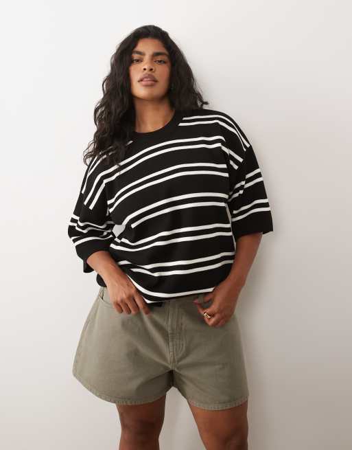 ASOS DESIGN Curve - T-shirt oversize in maglia compatta strutturata bianca e nera a righe
