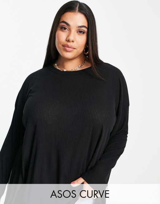 ASOS DESIGN Curve - Top con spacchi laterali a maniche lunghe e coste semplici nero