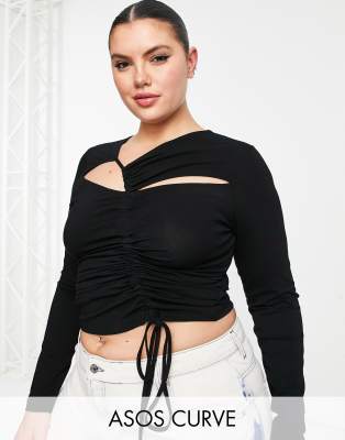 ASOS DESIGN Curve - Top nero a maniche lunghe con arricciatura e cut-out