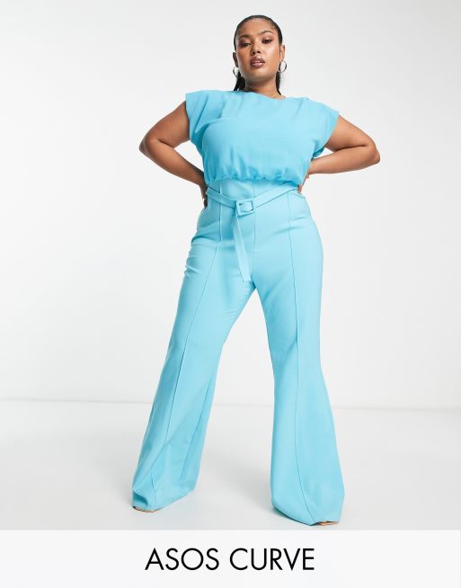 ASOS DESIGN Curve - Tuta jumpsuit in chiffon con top e pantaloni a zampa turchese con cintura