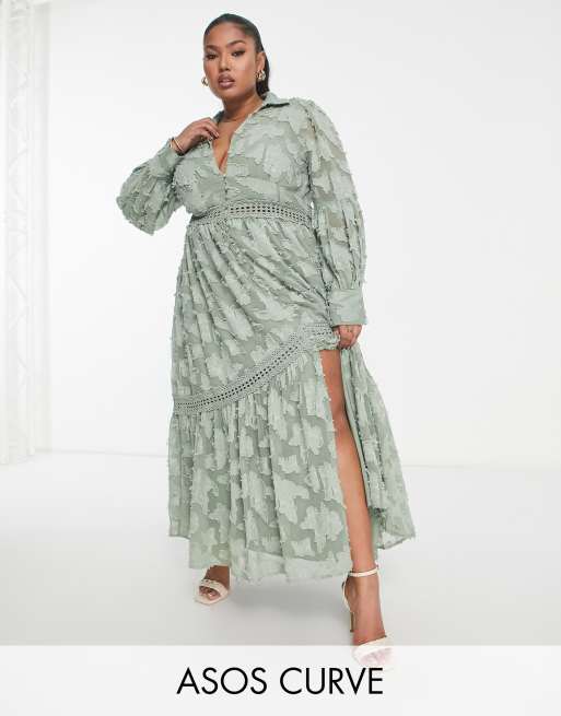 ASOS DESIGN Curve - Vestito camicia midi kaki con bottoni e inserti in pizzo dévoré