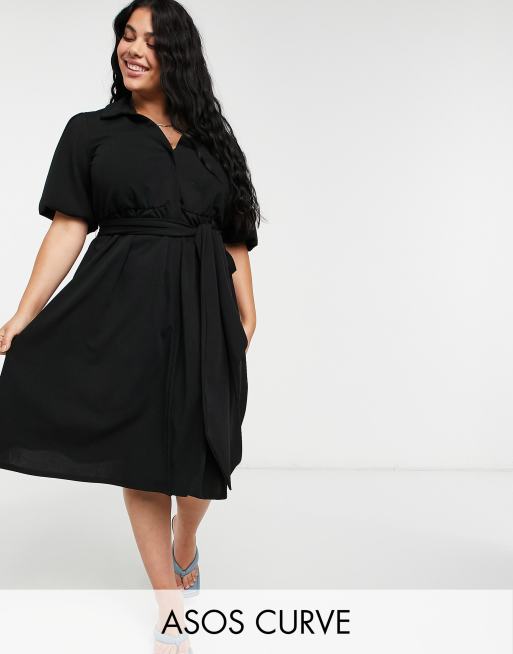 ASOS DESIGN Curve - Vestito camicia stile skater midi nero con davanti a portafoglio e cintura in tessuto