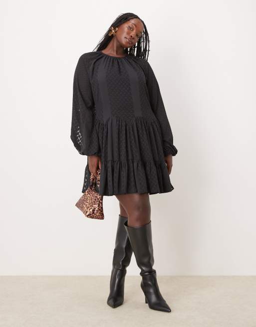 ASOS DESIGN Curve - Vestito corto nero jacquard dévoré accollato con gonna godet con bordi smerlati