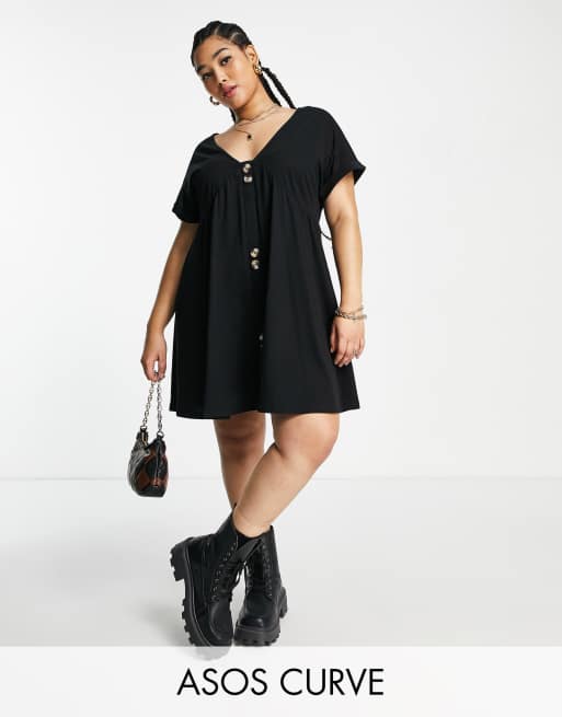 ASOS DESIGN Curve - Vestito grembiule corto nero a maniche corte con bottoni grandi