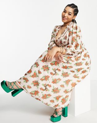 ASOS DESIGN Curve - Vestito grembiule midi a fiori rossi con polsini arricciati