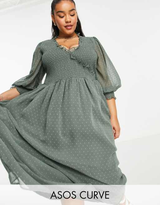ASOS DESIGN Curve - Vestito grembiule midi con polsini arricciati kaki plumetis