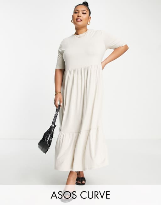 ASOS DESIGN Curve - Vestito grembiule midi stile T-shirt a balze color pietra