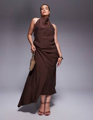 ASOS DESIGN Curve - Vestito lungo allacciato al collo con plissettatura color cioccolato