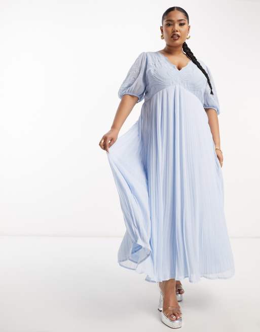 ASOS DESIGN Curve - Vestito lungo blu a pieghe in pizzo sangallo ricamato