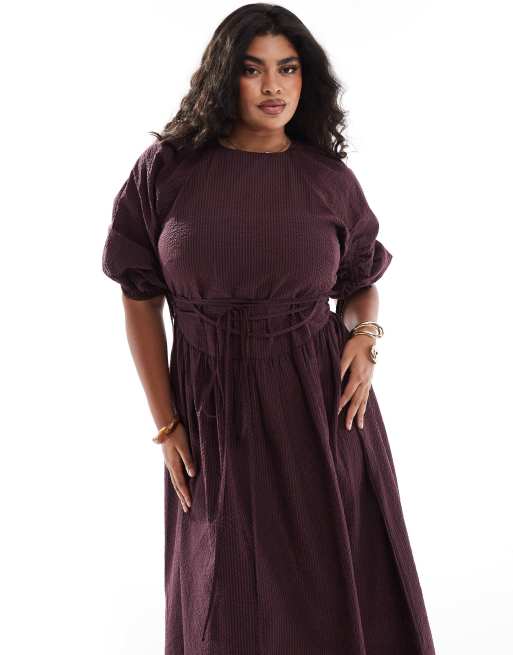 ASOS DESIGN Curve - Vestito midi allacciato in vita bordeaux con stampa a quadri