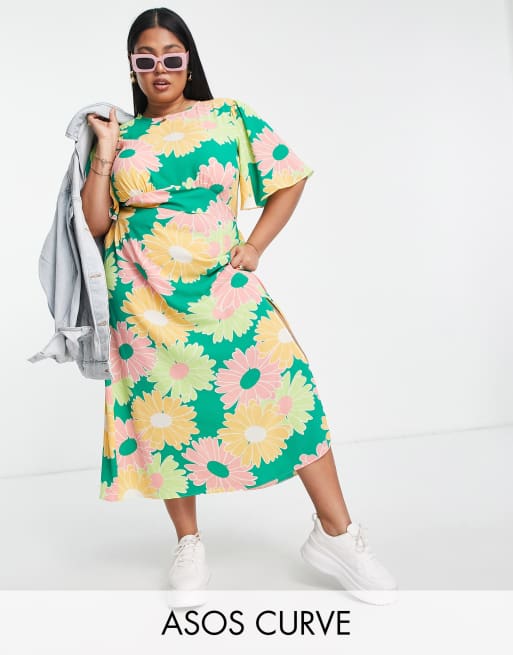 ASOS DESIGN Curve - Vestito midi con maniche a pipistrello aperto sul retro con stampa a fiori grandi