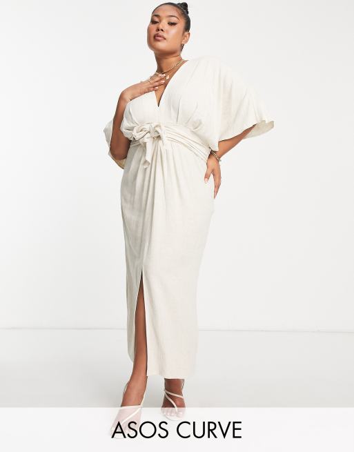 ASOS DESIGN Curve - Vestito midi in lino color naturale allacciato sul davanti con maniche ad ali di pipistrello
