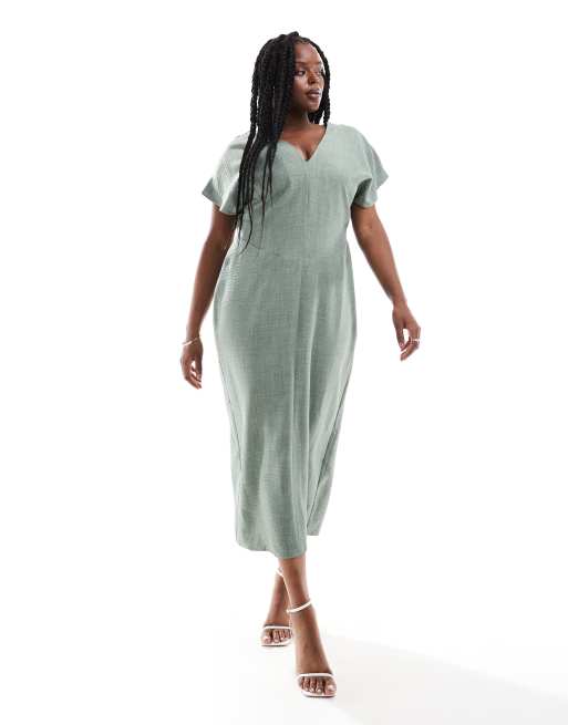 ASOS DESIGN Curve - Vestito midi kaki con scollo profondo e maniche a pipistrello