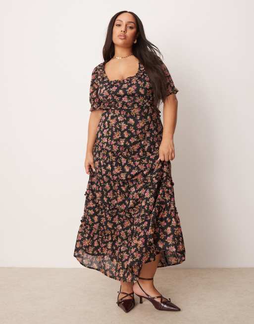 ASOS DESIGN Curve - Vestito midi scuro a fiori con scollo a cuore e cut-out