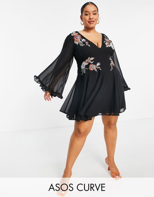 ASOS DESIGN Curve - Vestito skater corto morbido ricamato con godet e maniche svasate nero