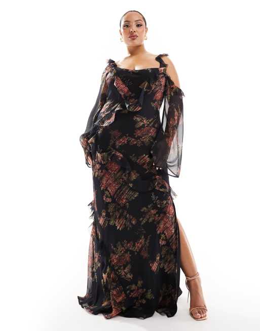 Esclusiva ASOS DESIGN Curve - Vestito lungo con maniche asimmetriche e volant effetto invecchiato con stampa a fiori sfumata