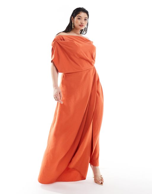 Esclusiva ASOS DESIGN Curve - Vestito lungo testurizzato ruggine con spalle scoperte e spacco profondo