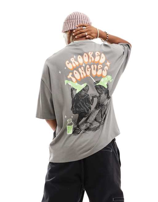 ASOS Crooked Tongues - T-shirt oversize grigia con stampa di gnomi sul retro