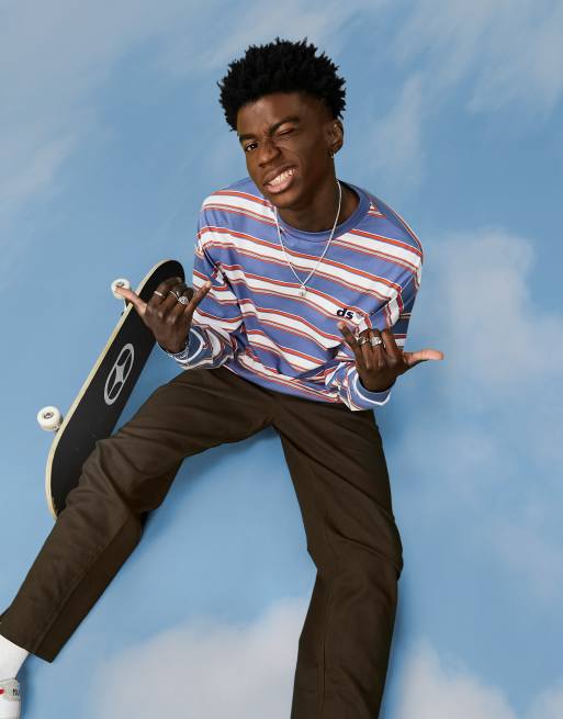 ASOS Daysocial - T-shirt oversize a maniche lunghe con stampa a righe e logo blu