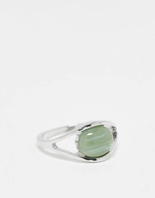 ASOS DESIGN - Anello argentato con sigillo con pietra sintetica verde giada