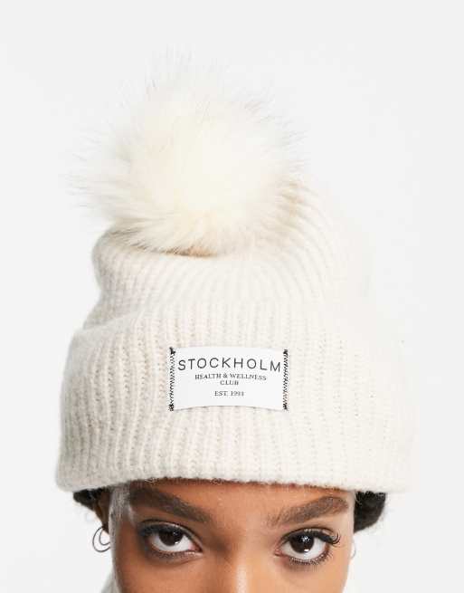 ASOS DESIGN - Berretto in maglia a coste con pompon crema con etichetta