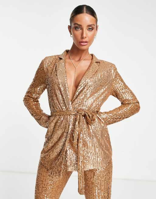ASOS DESIGN - Blazer avvolgente da abito in jersey oro rosa con paillettes