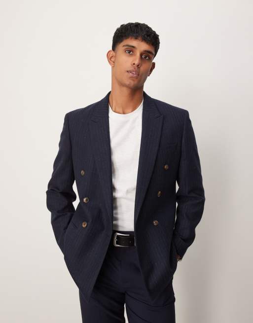 ASOS DESIGN - Blazer slim doppiopetto blu navy con motivo gessato