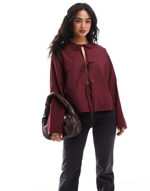 ASOS DESIGN - Blusa a maniche lunghe in popeline bordeaux allacciata sul davanti