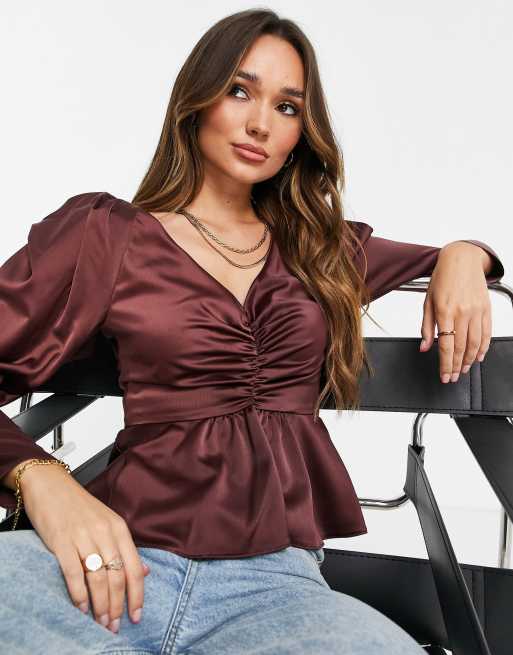ASOS DESIGN - Blusa a maniche lunghe voluminose con arricciatura sul davanti color vinaccia