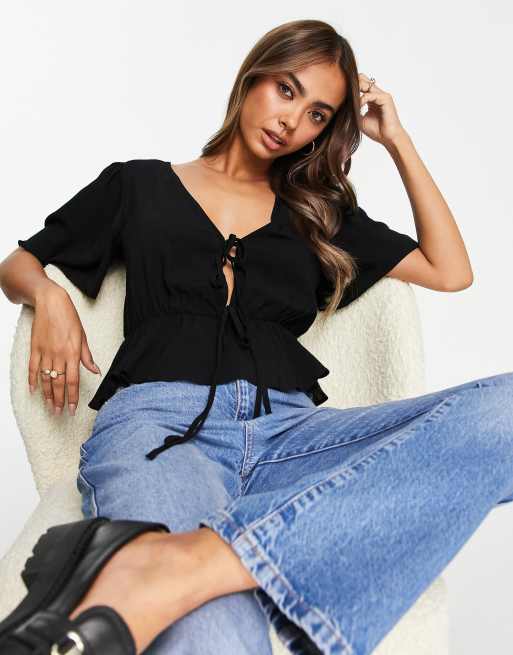ASOS DESIGN - Blusa da giorno con maniche a pipistrello nera con doppia allacciatura sul davanti e fondo peplo