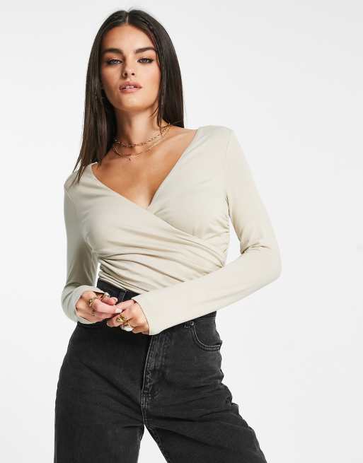 ASOS DESIGN - Body avvolgente color pietra a maniche lunghe