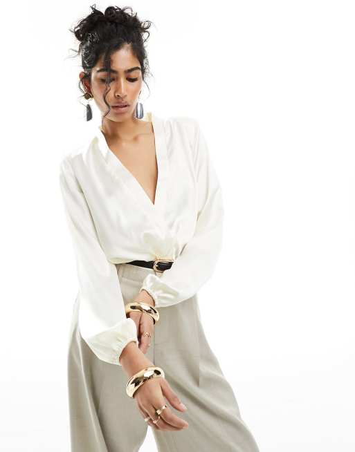ASOS DESIGN - Body color crema con scollo profondo e spalle imbottite