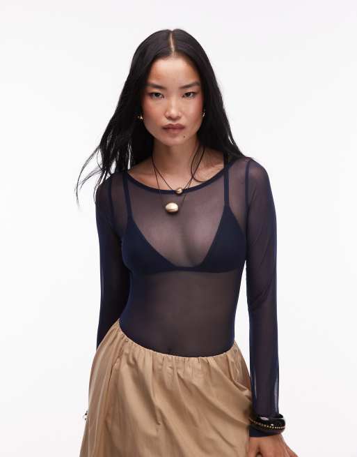 ASOS DESIGN - Body in rete blu navy con scollo molto ampio