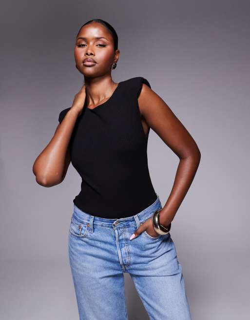 ASOS DESIGN - Body nero a coste con spalle imbottite