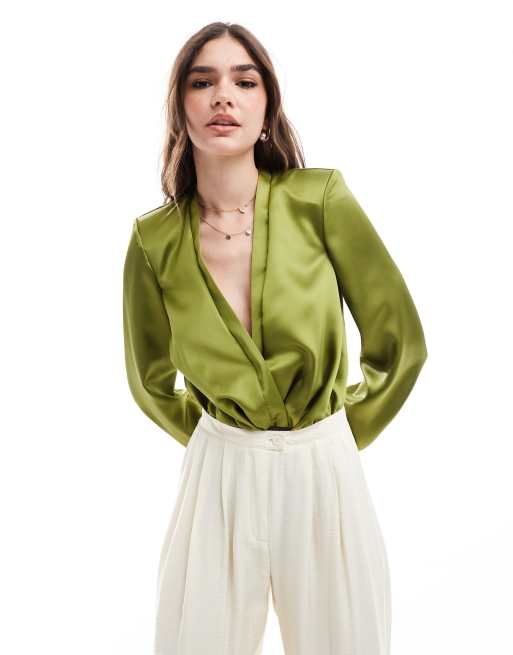 ASOS DESIGN - Body verde oliva con scollo profondo e spalle imbottite
