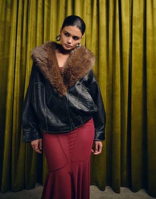 ASOS DESIGN - Bomber nero in pelle sintetica con colletto sciallato in pelliccia sintetica